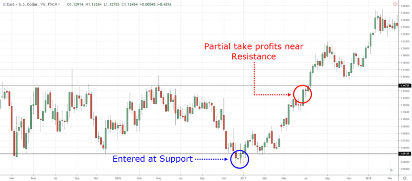 市场由区间和趋势构成。区间过后一般跟随着一段趋势。如上图,我们在蓝圈做多,不必在红圈处完全平仓,我们可以平仓一半,用剩下的仓位移动止损博取后面的趋势行情利润最大化。