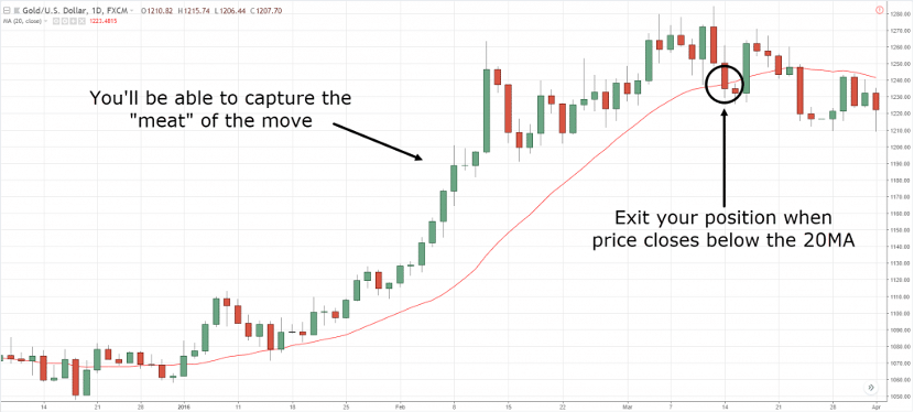 均线移动止损法是最简单的方法,当K线收盘跌破均线时,被动退场,如下图。