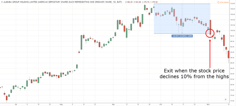 不需要图表来追踪止损,比如股票ABC股价100$,你可以设置跟踪止损百分比设为10%或20%,当股价从最高点跌去10%,选择主动退场。这种方法在等权重股票投资组合时比较有效。